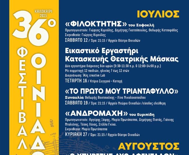 Το Αρχαίο Θέατρο Οινιαδών ανοίγει αυλαία στον Πολιτισμό και μας υποδέχεται στο 36ο Φεστιβάλ Αρχαίου Θεάτρου Οινιαδών το Σάββατο,12 Ιουλίου 2025, με την παράσταση «Φιλοκτήτης» του Σοφοκλή.