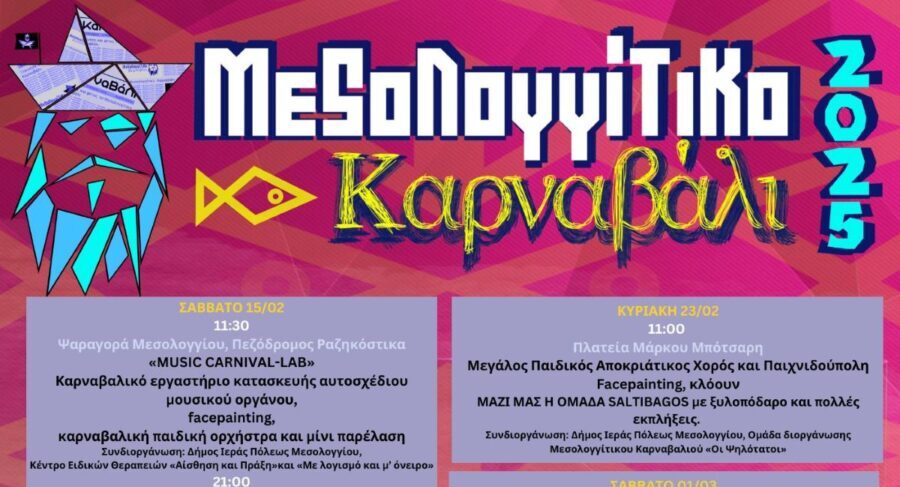 Ο Δήμος Ιερής Πόλης Μεσολογγίου ανακοινώνει το πρόγραμμα των αποκριάτικων εκδηλώσεων και σας προσκαλεί να διασκεδάσετε, να χορέψετε και να γελάσετε στο 40ο Μεσολογγίτικο Καρναβάλι!