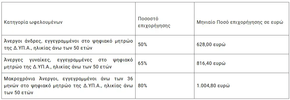 Το ποσό επιχορήγησης του κάθε ωφελούμενου σε μηνιαία βάση ανάλογα με την κατηγορία του ανέργου, ως εξής: