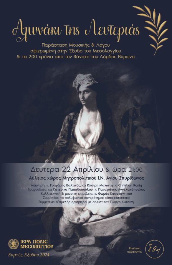 Παράσταση μουσικής & λόγου αφιερωμένη στην Έξοδο του Μεσολογγίου και τα 200 χρόνια από τον θάνατο του Λόρδου Βύρωνα.