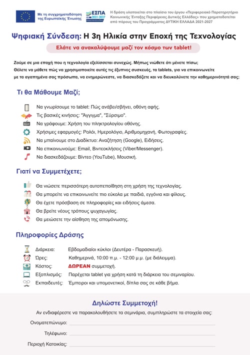 Πρόσκληση εκδήλωσης ενδιαφέροντος για τη δράση «Ψηφιακή Σύνδεση: Η 3η Ηλικία στην Εποχή της Τεχνολογίας».