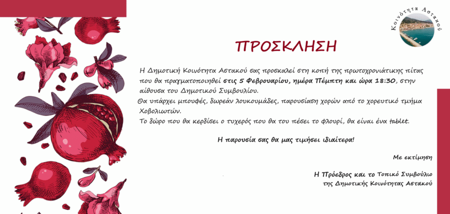 Η Δημοτική Κοινότητα Αστακού σας προσκαλεί στη κοπή της πρωτοχρονιάτικης πίτας που θα πραγματοποιηθεί στις 5 Φεβρουαρίου, ημέρα Πέμπτη και ώρα 18:30, στην αίθουσα του Δημοτικού Συμβουλίου.