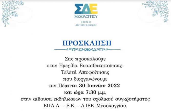 Σας προσκαλούμε στην Ημερίδα Ευαισθητοποίησης – Τελετή Αποφοίτησης που διοργανώνουμε την Πέμπτη 30 Ιουνίου 2022 και ώρα 7:30 μ.μ, στην αίθουσα εκδηλώσεων του σχολικού συγκροτήματος ΕΠΑ.Λ. – Ε.Κ. – Δ.ΙΕΚ Μεσολογγίου.