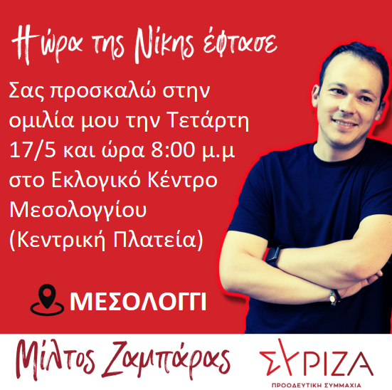 Σας προσκαλώ την Τεταρτη17 Μαΐου και ώρα 8:00 μμ στην ομιλία μου που θα πραγματοποιηθεί στο Εκλογικό Κέντρο ΣΥΡΙΖΑ – ΠΣστην Κεντρική Πλατεία Μεσολογγιου