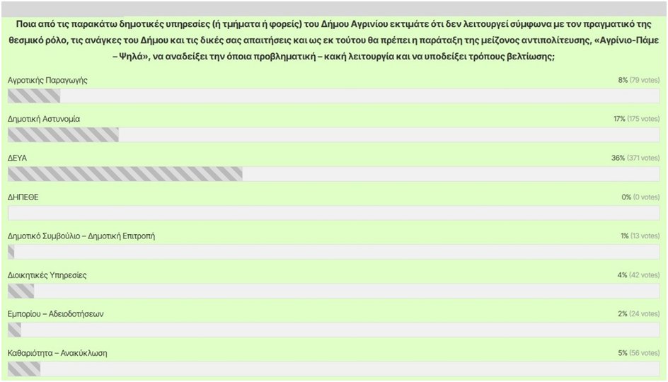 Πιο συγκεκριμένα, επί συνόλου 1040 συμμετοχών, οι 371 επέλεξαν τη συγκεκριμένη Δημοτική Επιχείρηση, ποσοστό 36%, που αντικατοπτρίζει προφανώς τη γενικότερη δυσαρέσκεια που υπάρχει, απόρροια όχι μόνο των αυξήσεων, αλλά της εν γένη προβληματικής λειτουργίας της ΔΕΥΑ. Αν στο παραπάνω ποσοστό προστεθεί και το 20% των Οικονομικών Υπηρεσιών, εύλογα οδηγούμαστε στο συμπέρασμα ότι περισσότεροι από τους μισούς δημότες προβάλλουν ως μείζον θέμα την οικονομική πολιτική του Δήμου Αγρινίου.