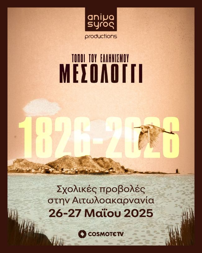 Το ντοκιμαντέρ κινουμένων σχεδίων της ANIMA SYROS Productions με τίτλο «Τόποι του Ελληνισμού: Μεσολόγγι», συμπαραγωγής με την COSMOTETV, σε σκηνοθεσία Δάφνης Ξουράφη και Αγησίλαου Ρόμπολα και σενάριο της ιστορικού Μαρίας Σαμπατακάκη, το οποίο αναπαριστά την μακραίωνη ιστορία της Ιερής Πόλης, ταξιδεύει σε σειρά σχολικών μονάδων του Δήμου μας για να συναντήσει τους μαθητές και τις μαθήτριες, σύμφωνα με το παρακάτω πρόγραμμα: