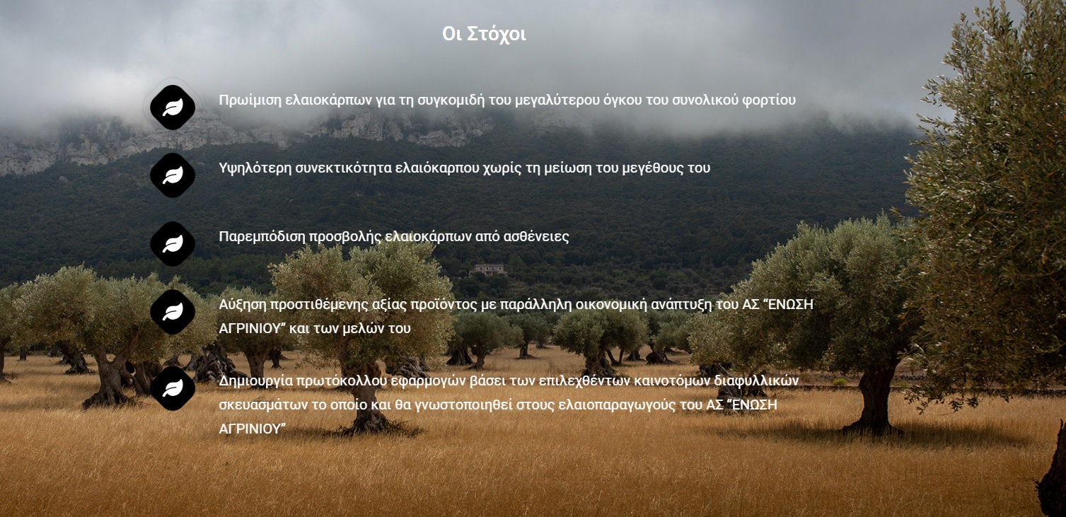 Το έργο με τίτλο “Βελτίωση της ποιότητας των συγκομισμένων ελαιοκάρπων ‘Καλαμών’ με προσυλλεκτικούς χειρισμούς στοχευμένους στην πρωίμιση, την παρεμπόδιση της μείωσης της συνεκτικότητας του καρπού και την εμφάνιση ασθενειών, και επίδραση αυτών στην ποιότητα και διατροφική αξία του επεξεργασμένου τελικού προϊόντος” θα συμβάλλει, μέσω μιας σειράς πρακτικών και χειρισμών, στην ανάπτυξη καινοτόμων διαφυλλικών σκευασμάτων με σκοπό την ταυτόχρονη ωρίμανση, την αύξηση της συνεκτικότητας και την παρεμπόδιση εμφάνισης ασθενειών των ελαιόκαρπων της ποικιλίας Καλαμών.