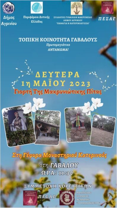 Ο Σύλλογος Γυναικών Μακρυνείας Δήμου Αγρινίου «Παναγία η Κατερινιώτισσα», ο Πολιτιστικός Σύλλογος Γαβαλούς και η Κοινότητα Γαβαλούς διοργανώνουν τη Γιορτή της Μακρυνιώτικης Πίτας.