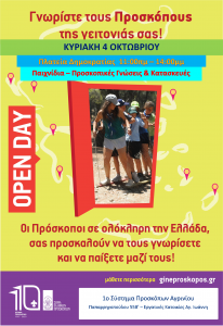 Οι Έλληνες Πρόσκοποι διοργανώνουν πανελλήνιο Open Day, με τίτλο «Γνωρίστε τους Προσκόπους της Γειτονιάς σας» το Σαββατοκύριακο 3-4 Οκτωβρίου 2020 και προσκαλούν κάθε ενδιαφερόμενο να γνωρίσει τη δράση και τα προγράμματα της μεγαλύτερης κίνησης για νέους στην πατρίδα μας και παγκόσμια.