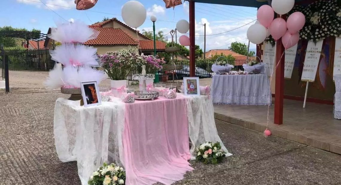 Στον προαύλιο χώρο του ναού υπάρχουν ροζ και άσπρα μπαλόνια, ενώ σε δύο τραπέζια έχουν τοποθετηθεί κουφέτα και γλυκίσματα.