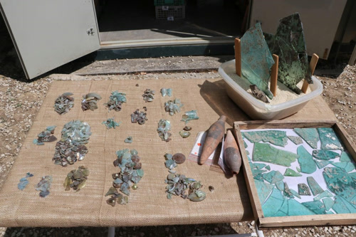Θραύσματα από γυαλί που ανακαλύφθηκαν στο ρωμαϊκό λουτρό στη Σαλαγασσό, ξανασυναρμολογήθηκαν για την ανάλυση.
