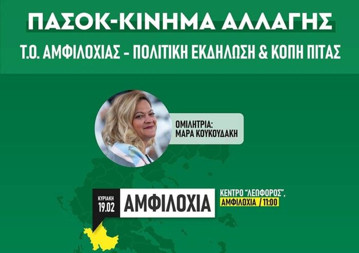 Συγκεκριμένα, στην Αμφιλοχία θα πραγματοποιηθεί πολιτική εκδήλωση & κοπή πίτας 19/2 και ώρα 11 στο κέντρο “ΛΕΩΦΟΡΟΣ” με ομιλήτρια την Μάρα Κουκουδάκη