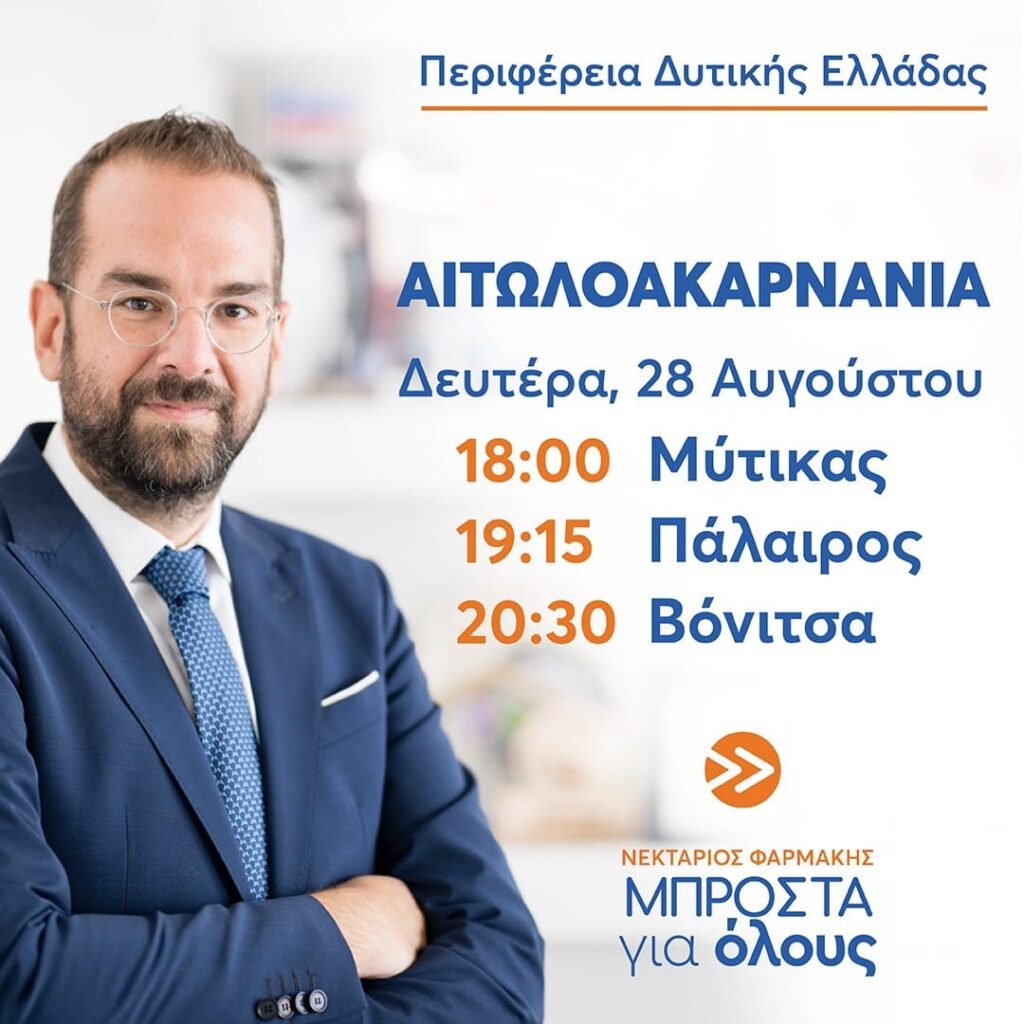 Τις περιοδείες του στα πλαίσια της υποψηφιότητας του ξεκίνησε ο Νεκτάριος Φαρμάκης .Ο Περιφερειάρχης τη Δευτέρα, 28 Αυγούστου θα περιοδεύσει σε Μύτικα, Πάλαιρο και Βόνιτσα