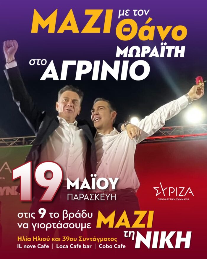 Ο υποψήφιος βουλευτής Αιτωλοακαρνανίας με τον ΣΥΡΙΖΑ – Προοδευτική Συμμαχία Θάνος Μωραΐτης, ολοκληρώνει την προεκλογική του εκστρατεία προσκαλώντας τους πολίτες του Αγρινίου σε μια βραδιά γιορτής και νίκης την Παρασκευή 19 Μαΐου και ώρα 9 το βράδυ στον πεζόδρομο 39ου Συντάγματος και Ηλία Ηλίου στα καφέ ILΝove, Loca και Cobo.