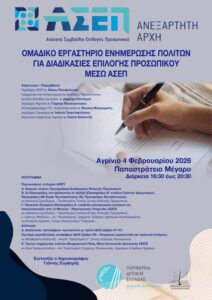 Στις 4 Φεβρουαρίου, στο Παπαστράτειο Μέγαρο Αγρινίου, το Ανώτατο Συμβούλιο Επιλογής Προσωπικού (ΑΣΕΠ), σε συνεργασία με την Περιφέρεια Δυτικής Ελλάδος, διοργανώνει εκδήλωση για ζητήματα που αφορούν την επιλογή και πρόσληψη προσωπικού στο δημόσιο.