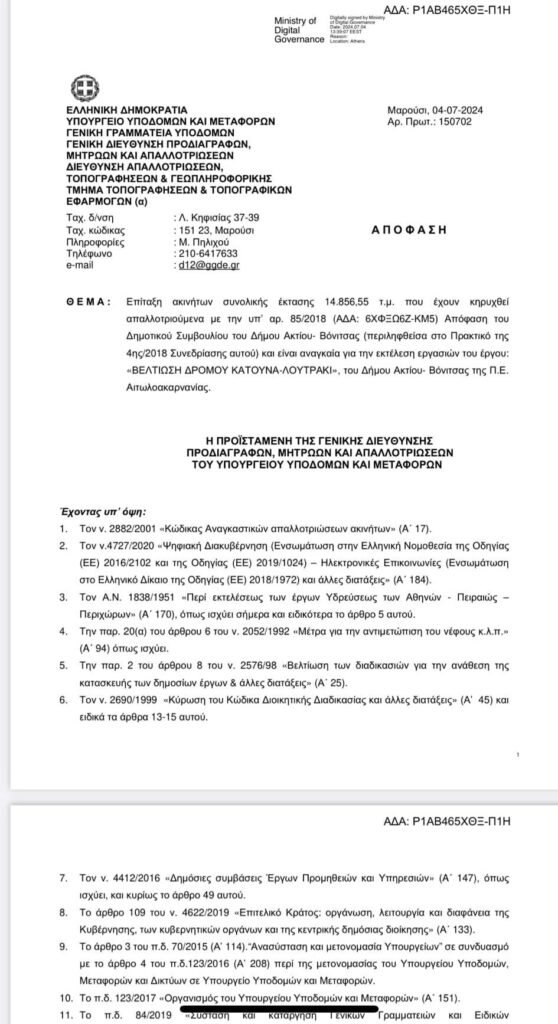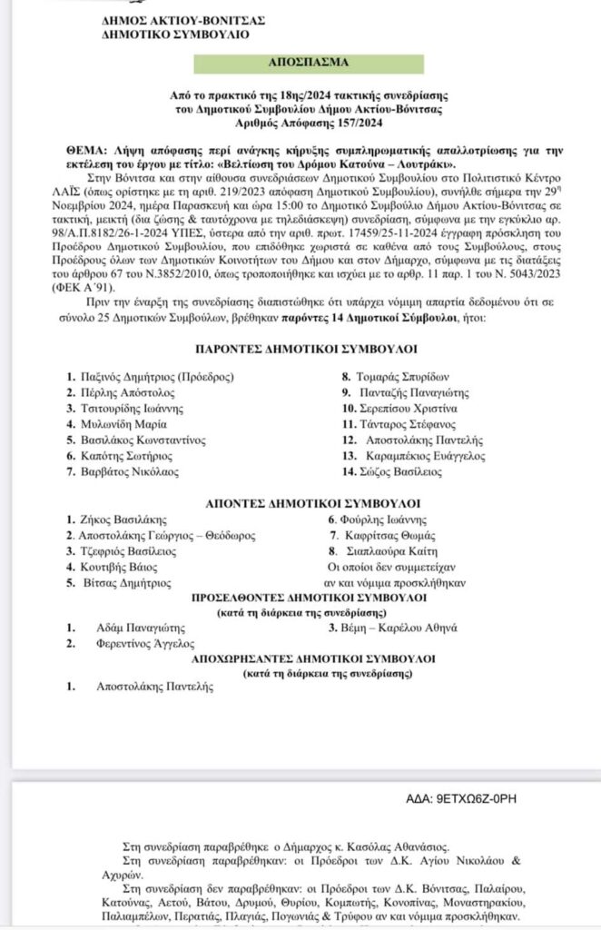 Μετά από εισήγηση του Δημάρχου Ακτίου-Βόνιτσας, Θανάση Κασόλα πέρασε στο Δημοτικό Συμβούλιο την Παρασκευή, 29/11/2024 νέα συμπληρωματική αναγκαστική απαλλοτρίωση στην περιοχή των ήδη απαλλοτριωμένων εκτάσεων επί της οδού Κατούνα – Λουτράκι συνολικού εμβαδού 60.912,72 τ.μ., με την 157/2024 απόφαση ΔΣ ,προκειμένου να πραγματοποιηθεί η διαπλάτυνση της ήδη υπάρχουσας οδού και η διαμόρφωση των γεωμετρικών της στοιχείων ώστε να μειωθούν οι ελιγμοί και να βελτιωθεί η βατότητα και η προσβασιμότητα αυτής.