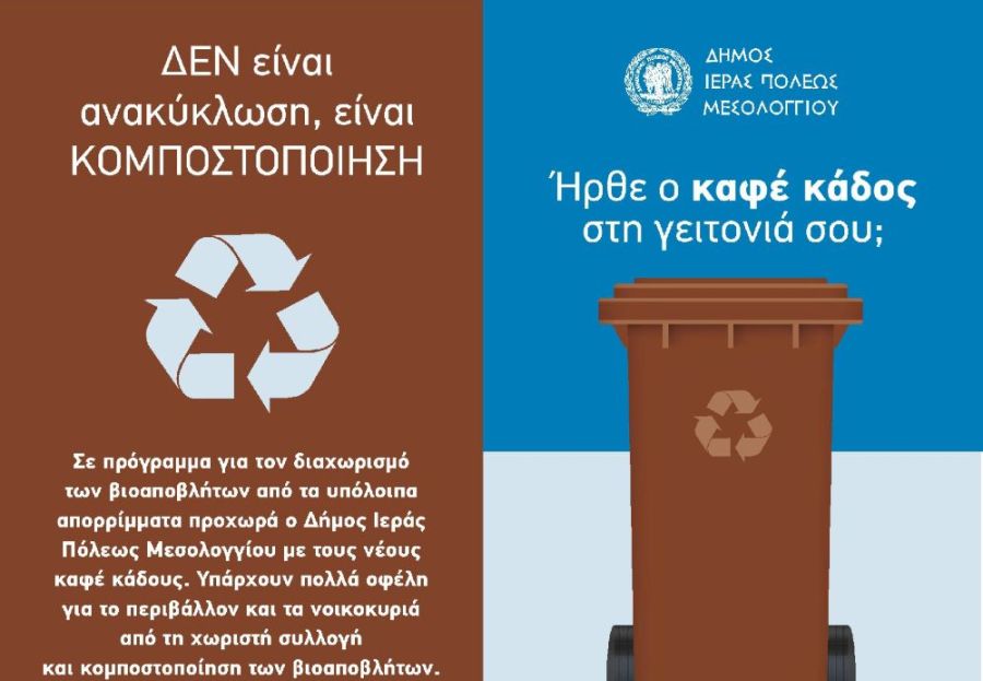 Ο Δήμος Ιερής Πόλης Μεσολογγίου ενημερώνει ότι ολοκληρώθηκε η τοποθέτηση των καφέ κάδων κομποστοποίησης βιοαποβλήτων σε σημεία του Δήμου. Υπενθυμίζεται ότι για την επιτυχία του εγχειρήματος απαιτείται η συνδρομή όλων μας!