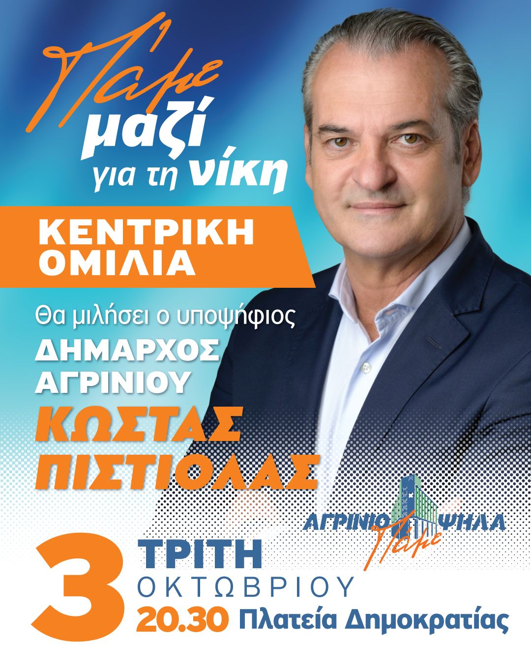 Σήμερα, Τρίτη 3 Οκτωβρίου, στις 20.30, στην πλατεία Δημοκρατίας, στο Αγρίνιο, θα λάβει χώρα η κεντρική προεκλογική ομιλία του υποψήφιου Δημάρχου Αγρινίου και επικεφαλής του Συνδυασμού «Αγρίνιο, Πάμε Ψηλά» Κώστα Πιστιόλα.