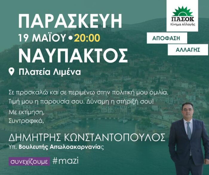 Μπορεί να είναι εικόνα 1 άτομο και κείμενο που λέει "ΠΑΣΟΚ Κίνημα Αλλαγής ΠΑΡΑΣΚΕΥΗ 19 ΜΑΪΟΥ 20:00 ΝΑΥΠΑΚΤΟΣ Πλατεία Λιμένα ΑΠΟΦΑΣΗ ΑΛΛΑΓΗΣ Σε τροσκαλώ και σε περιμένω στην πολιτική μου ομιλία. Τιμή μου η παρουσία σου. Δύναμη η στήριξή σου! Με εκτίμηση, Συντροφικά, ΔΗΜΗΤΡΗΣ ΚΩΝΣΤΑΝΤΟΠΟΥΛΟΣ Υπ. Βουλευτής Αιτωλοακαρνανίας συνεχίζουμε #mazi"