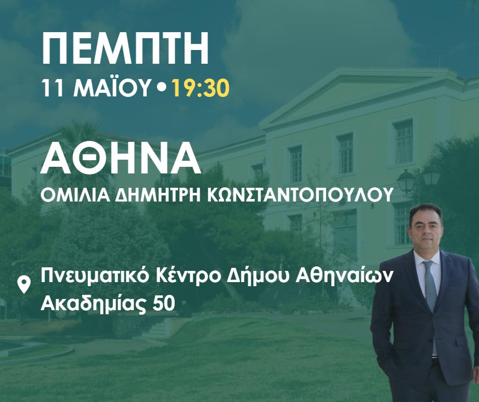 Μπορεί να είναι εικόνα 1 άτομο και κείμενο που λέει "ΠΕΜΠΤΗ 11 ΜΑΪΟΥ. 19:30 ΑΘΗΝΑ 11 ΟΜΙΛ›ΙΑ ΔΗΜΗΤΡΗ ΚΩΝΣΤΑΝΤΟΠΟΥΛΟΥ Πνευματικό Κέντρο Δήμου Αθηναίων Ακαδημίας 50"