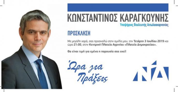 Σήμερα Τετάρτη 3 Ιουλίου 2019, θα πραγματοποιηθεί στο Αγρίνιο η προεκλογική ομιλία του υποψήφιου βουλευτή Αιτωλοακαρνανίας με τη Νέα Δημοκρατία, Κώστα Καραγκούνη στην Πλατεία Δημοκρατίας και ώρα 21:00