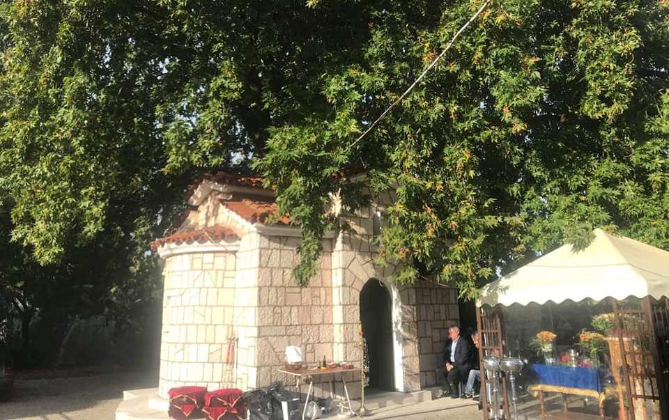 Στον τόπο όπου ο Άγιος μαρτύρησε, στον πλάτανο που βρίσκεται στον προαύλιο χώρο του Ιερού Ναού Αγίου Δημητρίου Αγρινίου