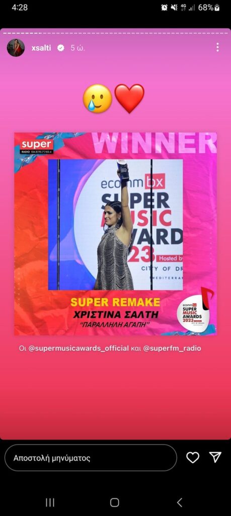 Η Αιτωλοακαρνάνισσα Χριστίνα Σάλτη κέρδισε το βραβείο, για το καλύτερο Super Remake της χρονιάς, με το τραγούδι «Παράλληλη αγάπη».