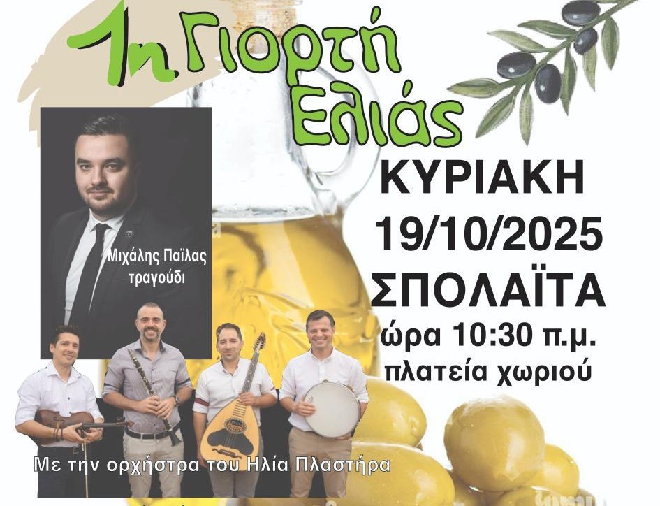 Ο Εξωραϊστικός Πολιτιστικός Σύλλογος Σπολάϊτας “Η Αγία Παρασκευή” διοργανώνει την 1η Γιορτή Ελιάς την Κυριακή 19 Οκτωβρίου 2025 και ώρα 10:30 το πρωί στην πλατεία του χωριού.