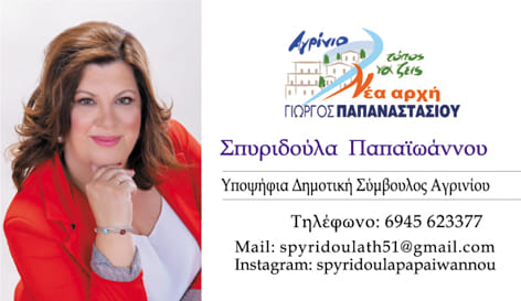Μια από τις πιο ”φρέσκιες” και δυνατές γυναικείες υποψηφιότητες σε αυτές τις αυτοδιοικητικές εκλογές είναι η υποψήφια δημοτική σύμβουλος στο Δήμο Αγρινίου, Σπυριδούλα Παπαϊωάννου, ενεργός πολίτης της πόλης με ανιδιοτελή προσφορά στα κοινά κάτι που διαφαίνεται και μέσα από το πλούσιο βιογραφικό της.