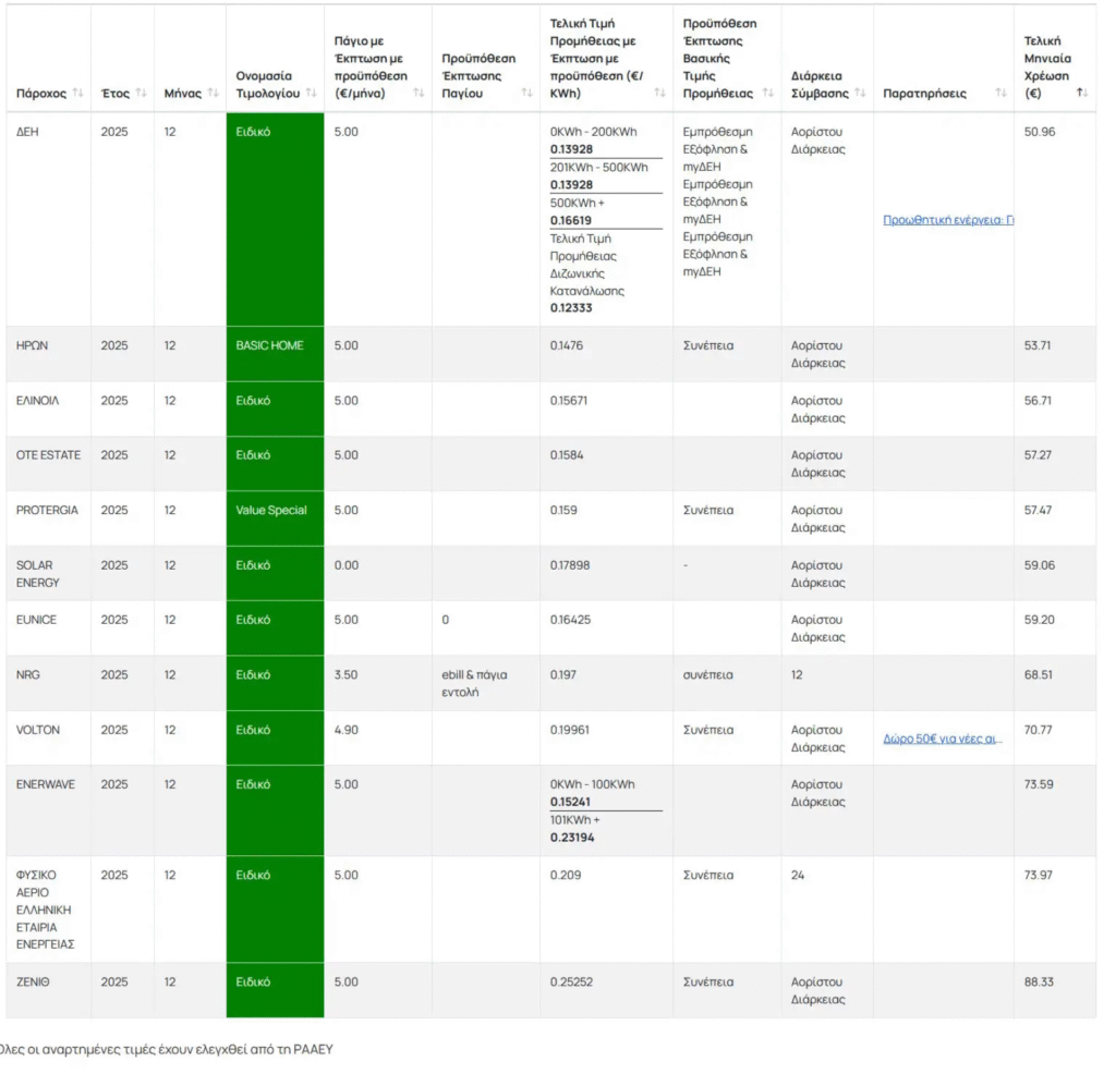Αναλυτικά, τα πράσινα οικιακά τιμολόγια για το Δεκέμβριο έχουν ως εξής: