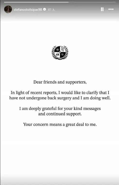 Με μία γραπτή δήλωσε στο instagram θέλησε ο Στέφανος Τσιτσιπάς να καθησυχάσει τους θαυμαστές του. Διέψευσε κάποια δημοσιεύματα που είχαν κυκλοφορήσει και θα είναι έτοιμος, όπως φαίνεται να αγωνιστεί στο Six Kings Slam, που θα γίνει στη Σαουδική Αραβία (15 – 18/10/25).