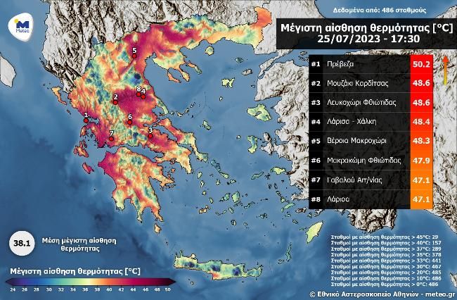 Συνεχίζονται οι συνθήκες καύσωνα την Τρίτη 25/07, σύμφωνα με δίκτυο αυτόματων μετεωρολογικών σταθμών του Εθνικού Αστεροσκοπείου Αθηνών / Meteo.gr με τις μέγιστες θερμοκρασίες να ξεπερνούν τους 40 °C, όπως ευδιάκριτα παρουσιάζεται με τη χρωματική κλίμακα θερμοκρασιών του παρακάτω Χάρτη 1, με την υψηλότερη μέγιστη θερμοκρασία να σημειώνεται στη Λευκοχώρι Φθιώτιδας με 43,3 °C, ενώ πρέπει να επισημανθεί ότι 55 μετεωρολογικοί σταθμοί κατέγραψαν μέγιστες θερμοκρασίες άνω των 40 °C.