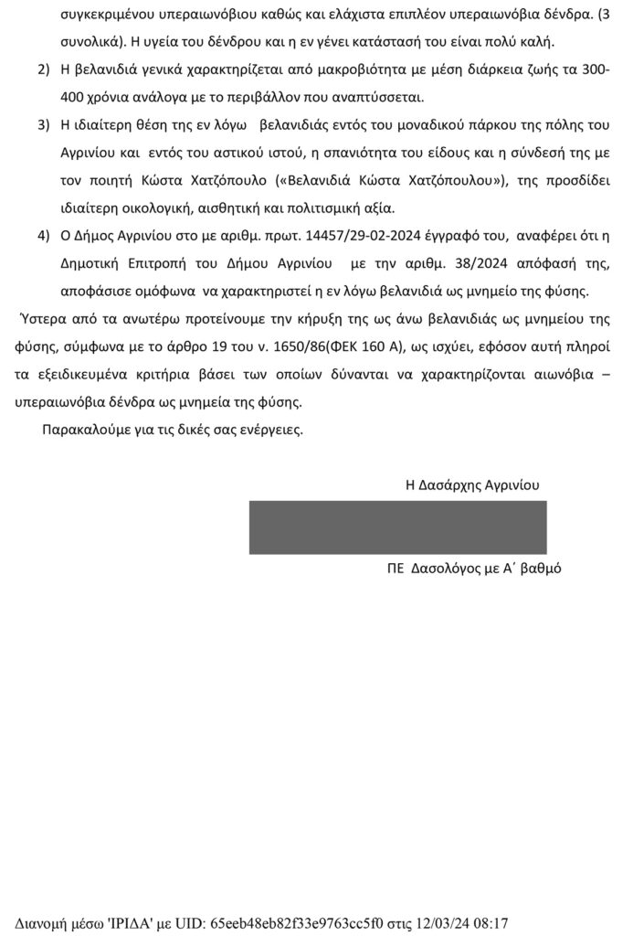«Προτείνουμε την κήρυξη της ως άνω βελανιδιάς ως μνημείου της φύσης, σύμφωνα με το άρθρο 19 του ν. 1650/86 (ΦΕΚ 160 Α), ως ισχύει, εφόσον αυτή πληροί τα εξειδικευμένα κριτήρια βάσει των οποίων δύνανται να χαρακτηρίζονται αιωνόβια – υπεραιωνόβια δένδρα ως μνημεία της φύσης».