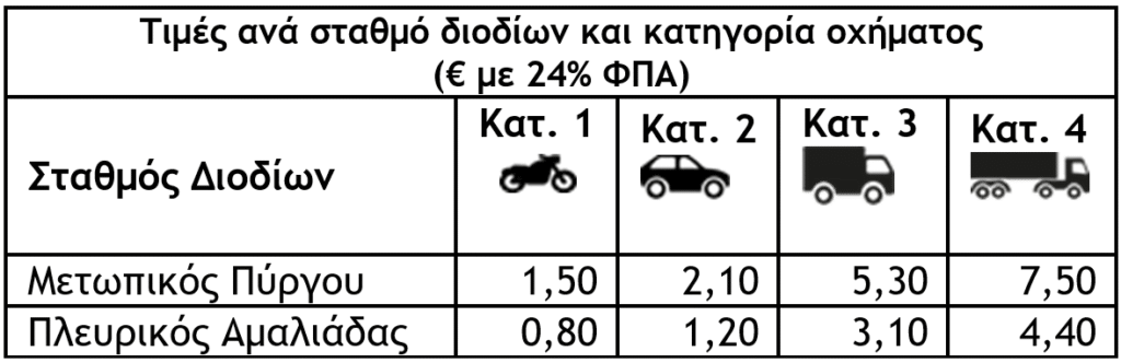Συγκεκριμένα, η σταδιακή λειτουργία του συστήματος χρέωσης αφορά τον μετωπικό σταθμό Πύργου και στις δύο κατευθύνσεις και τον πλευρικό σταθμό Αμαλιάδας με χρέωση από/προς Πύργο.