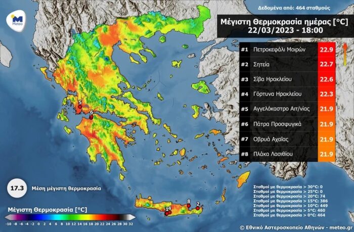 Πλησίασε τους 23 βαθμούς Κελσίου η σημερινή θερμοκρασία στην Κρήτη σύμφωνα με το meteo. Συνολικά 74 αυτόματοι μετεωρολογικοί σταθμοί του Εθνικού Αστεροσκοπείου Αθηνών/meteo.gr κατέγραψαν θερμοκρασία άνω των 20°C, με τις υψηλότερες τιμές να σημειώνονται στην Κρήτη και τη Δυτική Ελλάδα.