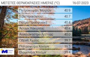 Πτώση σημείωσε η θερμοκρασία την Κυριακή 16/07 σε ολόκληρη τη χώρα, ωστόσο σύμφωνα με δίκτυο αυτόματων μετεωρολογικών σταθμών του Εθνικού Αστεροσκοπείου Αθηνών / Meteo.gr οι μέγιστες θερμοκρασίες στη Δυτική Ελλάδα και στη Νότια Κρήτη, ξεπέρασαν τοπικά τους 40 βαθμούς. 78 μετεωρολογικοί σταθμοί κατέγραψαν μέγιστες άνω των 37 βαθμών Κελσίου. Στον πίνακα που ακολουθεί παρουσιάζονται οι 8 σταθμοί όπου καταγράφηκαν οι υψηλότερες θερμοκρασίες της ημέρας.