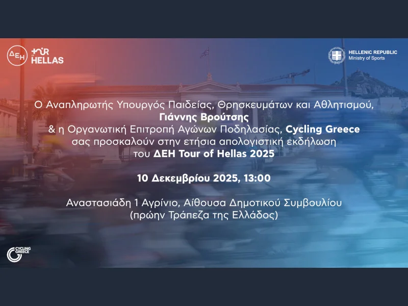 Eτήσια απολογιστική εκδήλωση “ΔΕΗ Tour of Hellas 2025” θα πραγματοποιηθεί την Τετάρτη 10 Δεκεμβρίου 2025 και ώρα 13:00, παρουσία του Αναπληρωτή Υπουργού Παιδείας, Θρησκευμάτων και Αθλητισμού κ. Γιάννη Βρούτση, καθώς και της Οργανωτικής Επιτροπής Αγώνων Ποδηλασίας “Cycling Greece”.