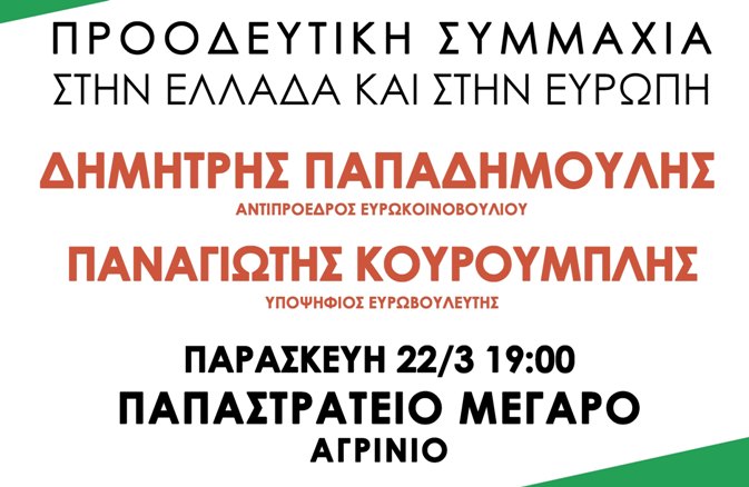 Ο Δημήτρης Παπαδημούλης,  αντιπρόεδρος του Ευρωκοινοβουλίου,  και ο πρώην υπουργός, βουλευτής και υποψήφιος ευρωβουλευτής Παναγιώτης Κουρουμπλής θα μιλήσουν στην εκδήλωση που διοργανώνει ο ΣΥΡΙΖΑ, για τις ευρωεκλογές του Μαΐου, την Παρασκευή 22 Μαρτίου στις 7 μ.μ.  στο Παπαστράτειο Μέγαρο Αγρινίου