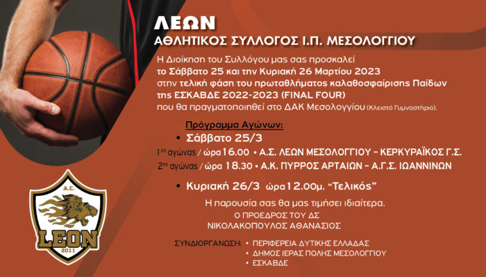 Η Διοίκηση του ΛΕΩΝ Αθλητικού Συλλόγου Μεσολογγίου αισθάνεται ιδιαίτερη χαρά και περηφάνια αφού η πλειοψηφία των μικρών αθλητών προέρχονται από τα σπλάχνα του Συλλόγου και μάλιστα εκ ιδρύσεώς του όταν το 2013 δημιουργήθηκαν αντίστοιχες υποδομές και ακαδημία Μπάσκετ.