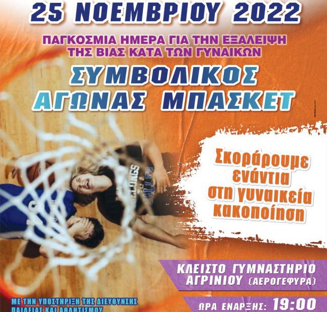• Το απόγευμα της25ης Νοεμβρίου 2022,με τη συνδρομή της Διεύθυνσης Παιδείας και Αθλητισμού του Δήμου Αγρινίου, θα «σκοράρουμε ενάντια στη γυναικεία κακοποίηση», σ’ έναν συμβολικό αγώνα μπάσκετ, με τη συμμετοχή παλαίμαχων καλαθοσφαιριστών, ο οποίος θα λάβει χώρα στο Κλειστό Γυμναστήριο Αγρινίου (Αερογέφυρα), στις 19:00.