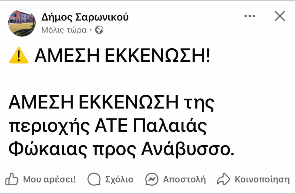 Ο Δήμος Σαρωνικού με μήνυμα του 112 κάλεσε επίσης σε άμεση εκκένωση της περιοχής ΑΤΕ Παλαιάς Φώκαιας προς Ανάβυσσο.