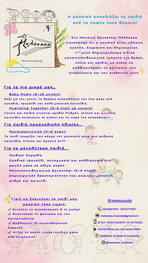 Το Μουσικό Εργαστήρι Μελόεσσα διοργανώνει συνάντηση γνωριμίας με τα μουσικοπαιδαγωγικά του τμήματα, το Σάββατο 4 Οκτωβρίου στις 11:00 π.μ., στον χώρο του εργαστηρίου (Αγίου Χριστοφόρου 97, Αγρίνιο).