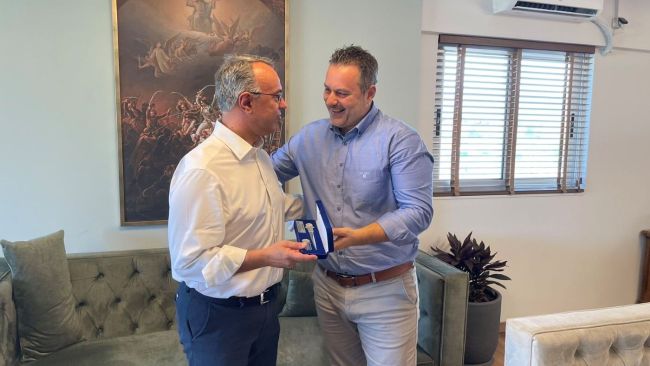 Ο Δήμαρχος Ιερής Πόλης Μεσολογγίου Σπύρος Διαμαντόπουλος υποδέχθηκε τον Υπουργό Υποδομών και Μεταφορών Χρήστο Σταϊκούρα στο γραφείο του στο Δημαρχείο σήμερα Πέμπτη, 18 Ιουλίου 2024.