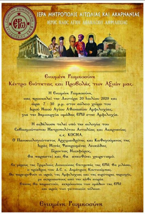 Η Ενωμένη Ρωμηοσύνη  προσκαλεί την Δευτέρα 20 Ιουλίου 2020 και ώρα 7:30 μ.μ. στον αύλειο χώρο του Ιερού Ναού Αγίου Αθανασίου Αμφιλοχίας σε συνάντηση για την δημιουργία ομάδας ΕΡΩ στην Αμφιλοχία. Η εκδήλωση τελεί υπό την ευλογία του Σεβασμιώτατου Μητροπολίτου Αιτωλίας και Ακαρνανίας κ.κ. Κοσμά ενώ ο Πανοσιολογιώτατος Αρχιμανδρίτης και Καθηγούμενος της Ιεράς Μονής Φανερωμένης Λευκάδας Γέροντας Νικηφόρος θα παραστεί και θα απευθύνει χαιρετισμό.