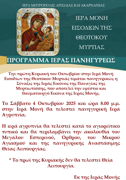 Το Σάββατο  4 Οκτωβρίου 2025 και ώρα 8.00 μ.μ. στην Ιερά Μονή θα τελεστεί πανηγυρική Ιερά Αγρυπνία.