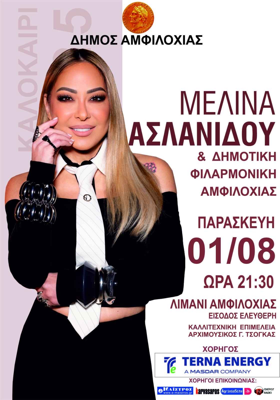 Ο Δήμος Αμφιλοχίας στο πλαίσιο των καλοκαιρινών εκδηλώσεων «Πανακαρνάνεια 2025» διοργανώνει με τη Δημοτική Φιλαρμονική Αμφιλοχίας την Παρασκευή 1 Αυγούστου 2025 στο λιμάνι της Αμφιλοχίας συναυλία με τη Μελίνα Ασλανίδου, μια από τις κορυφαίες γυναικείες φωνές της ελληνικής μουσικής σκηνής.