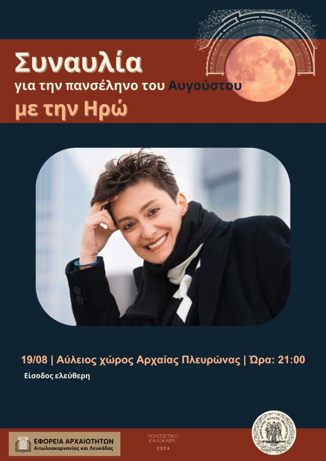 Ο Δήμος Ιερής Πόλης Μεσολογγίου και η Εφορεία Αρχαιοτήτων Αιτωλοακαρνανίας και Λευκάδας σας περιμένουν απόψε Δευτέρα, 19 Αυγούστου 2024 στις 21:00 στον αύλειο χώρο της αρχαίας Πλευρώνας για μια συναυλία με την Ηρώ, κάτω από το σαγηνευτικό φως της αυγουστιάτικης πανσελήνου!