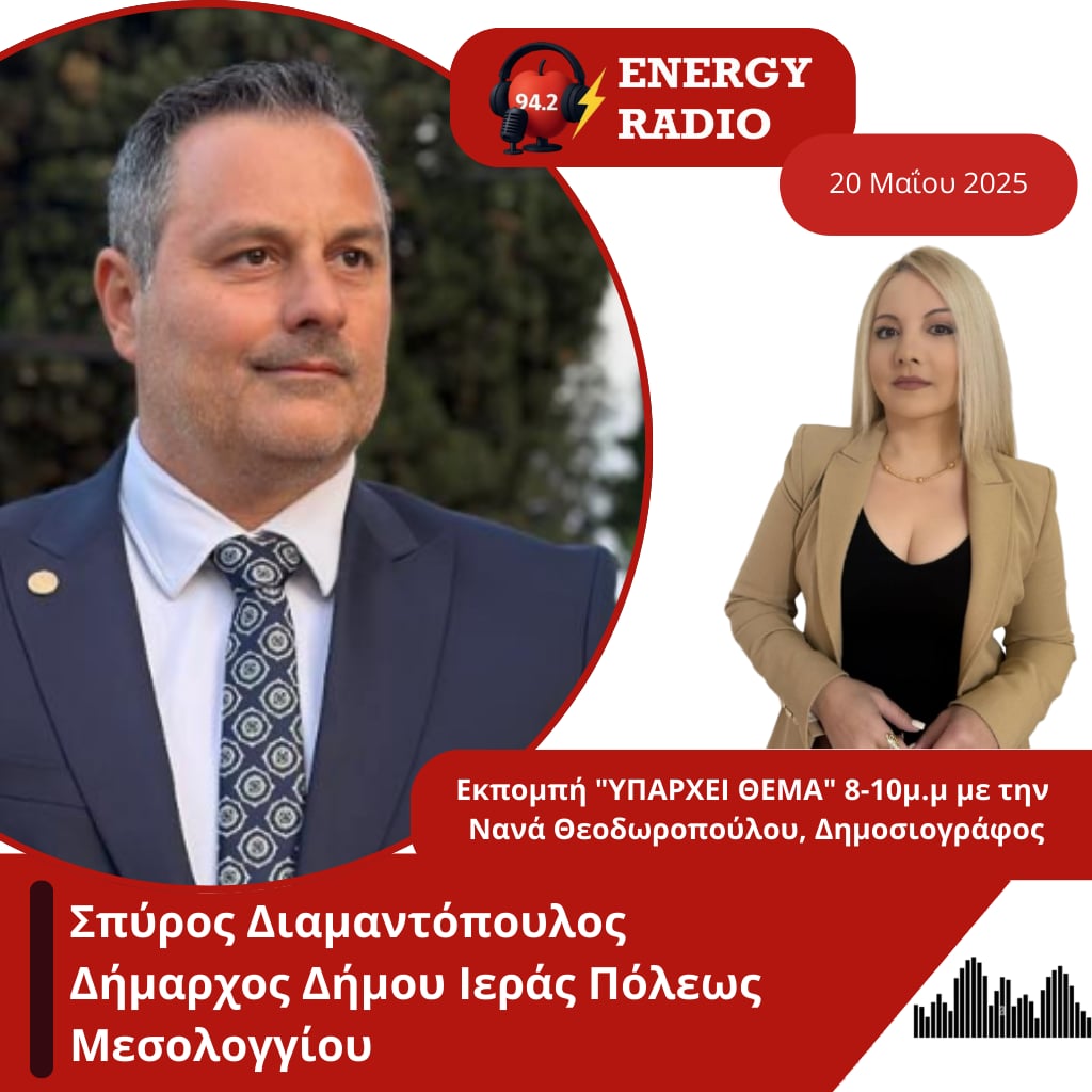 Συνέντευξη παραχώρησε ο Δήμαρχος Ι.Π. Μεσολογγίου, Σπύρος Διαμαντόπουλος στην δημοσιογράφο Νανά Θεοδωροπούλου, στην εκπομπή «ΥΠΑΡΧΕΙ ΘΕΜΑ» στον Energy 94.2 Ο κ. Διαμαντόπουλος κληθείς να σχολιάσει την συρρίκνωση των υπηρεσιών και το άνοιγμα των καταστημάτων την Κυριακή αναφέρθηκε στην προσπάθεια που καταβάλλει ο Δήμος στο πλαίσιο των δυνατοτήτων του ενώ σχετικά με την διαβούλευση με επαγγελματίες και φορείς περί προαιρετικού κυριακάτικου ανοίγματος καταστημάτων υπογράμμισε ότι η συζήτηση αυτή αποτέλεσε μια σημαντική ευκαιρία να παρουσιάσει τον συνολικό σχεδιασμό της Δημοτικής Αρχής τόσο στο ζήτημα αυτό όσο και σε μια σειρά άλλων δράσεων και πρωτοβουλιών που αναμένεται να θεσμοθετηθούν και να υλοποιηθούν μέσα στους επόμενους μήνες