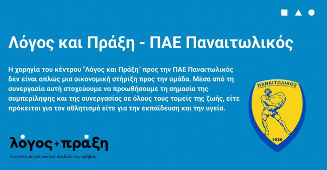 Το κέντρο μας ‘Λόγος και Πράξη’ είναι στην ευχάριστη θέση να ανακοινώσει τη συνεργασία με την ΠΑΕ Παναιτωλικός, η οποία μας γεμίζει χαρά και υπερηφάνεια, καθώς θα έχουμε τη δυνατότητα να βρεθούμε στο πλευρό της αγαπημένης μας ομάδας, στηρίζοντάς την στην επίτευξη των στόχων της, αγωνιζόμενη στην υψηλότερη επαγγελματική κατηγορία της χώρας.