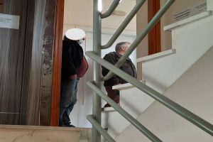Έτσι σημαντικός αριθμός ασθενών, καρκινοπαθών και άλλων σοβαρών παθήσεων, καθημερινά συνωστίζεται στις σκάλες της πολυκατοικίας και φυσικά επ’ ουδενί  δεν μπορεί να τηρηθεί η απόσταση των 2 μέτρων που γράφει η ταμπέλα στην είσοδο;